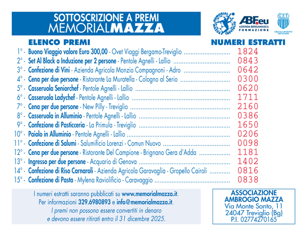Ecco i numeri dei biglietti vincenti i premi della sottoscrizione del 32° Memorial Mazza, estratti mercoledì 29 ottobre. 1° – Buono Viaggio valore Euro